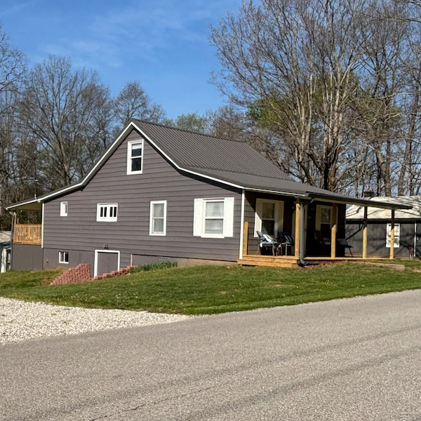 This cozy cottage in Southern Indiana is 30 miles from Louisville. The home is 14 miles to the Salem Speedway, and 10 miles to Huber's Winery. Enjoy 20 acres of woods with hiking trails and 2 creeks. The 1½ story 1440 sq. ft. Cottage has a detached garage, open floor plan, fully stocked kitchen, firepit and bright Sunroom! This home sleeps 4 and is more than just a place to rest your head - it's a retreat for your mind, body, & soul. Enjoy the scampering of squirrels/ glimpses of deer off the back covered deck. Listed on AirBnB